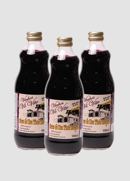 Suco de Uva Integral. Sem adição de água, açúcar ou conservantes. Feito apenas com o suco da uva. Quantidade: 03 garrafas de 500ml/ Cada Características: Encorpado e doce.